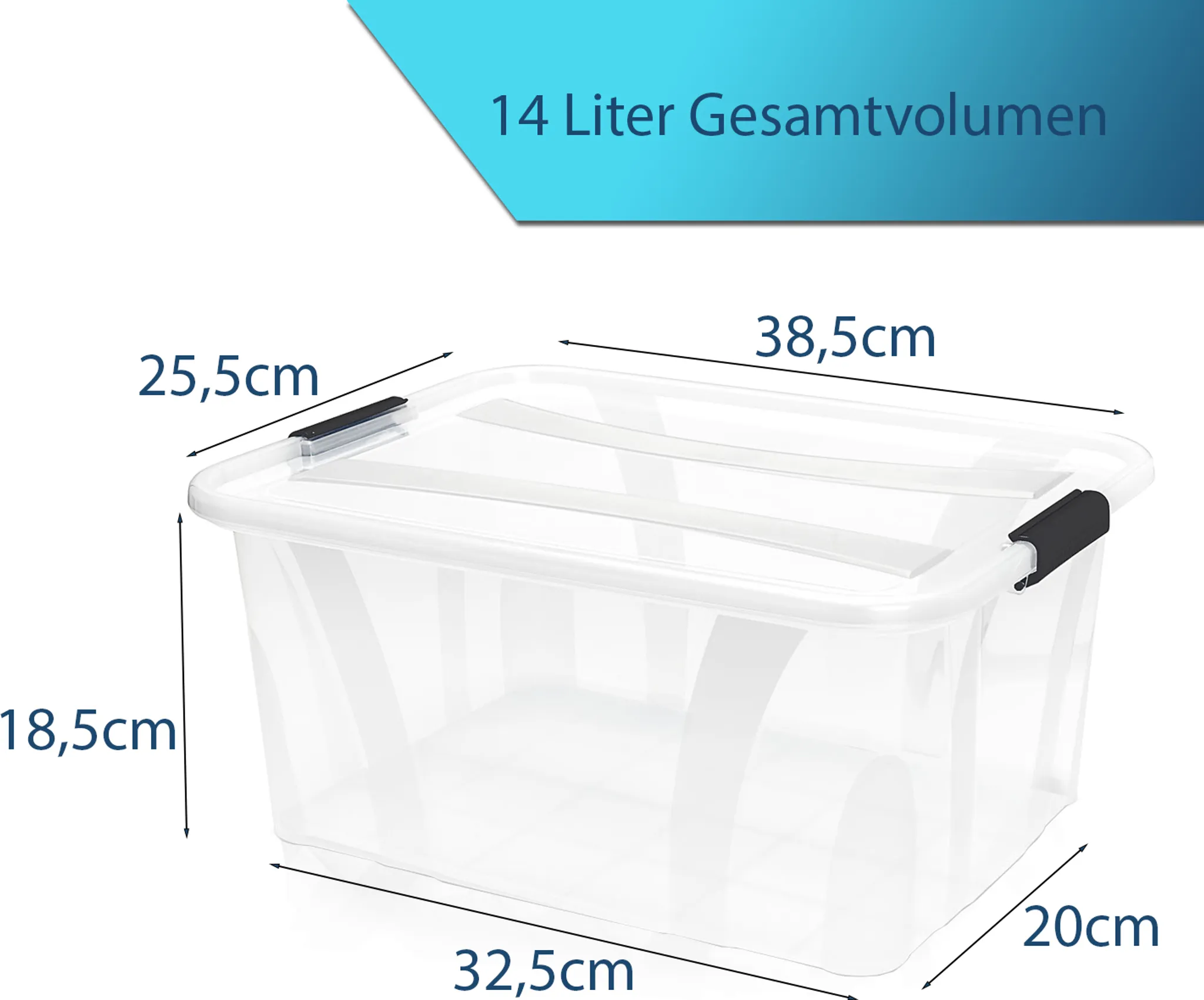Lieferumfang: 2 × Aufbewahrungsbox 14 L mit Deckel und Clipverschluss.