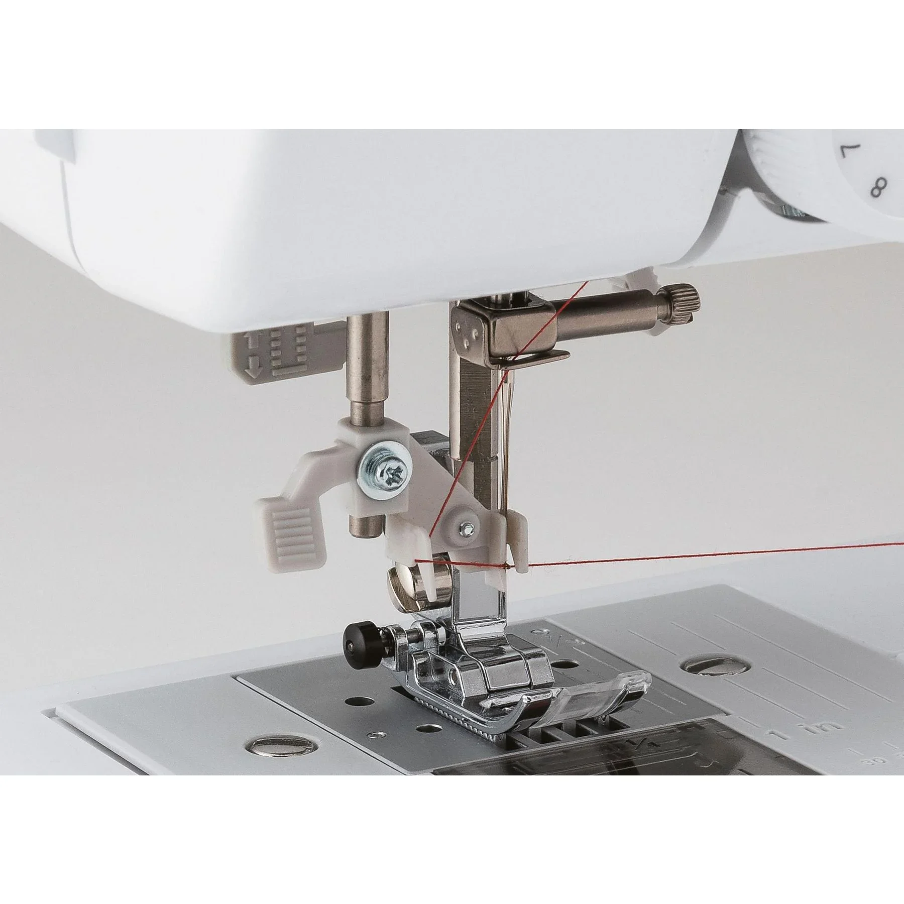 Highlights: Nähen ohne Fußpedal möglich, Nadel-Positionstaste, robustes Gehäuse, Online-Tutorials, automatische Einfädelhilfe, stufenlose Stichanpassung, LED-Licht sowie Freiarm für Rundnähte.