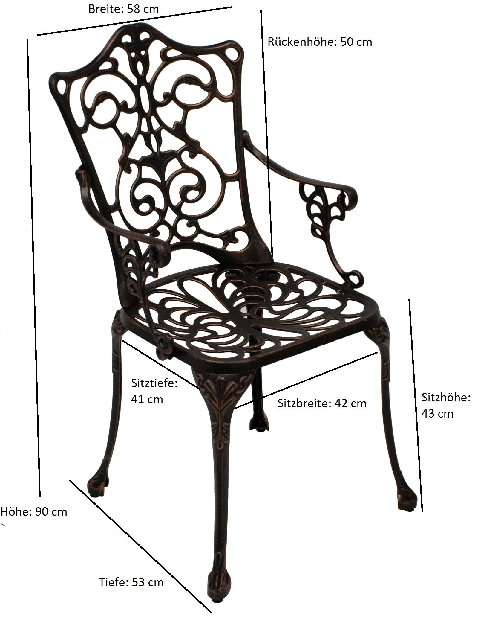 Die edle Bronze-Antik-Beschichtung verleiht der Essgruppe eine elegante Ausstrahlung und macht sie zu einem dekorativen Mittelpunkt auf Terrasse, Balkon oder im Garten. Trotz stabiler Verarbeitung bleibt das Set angenehm leicht und lässt sich flexibel umstellen.