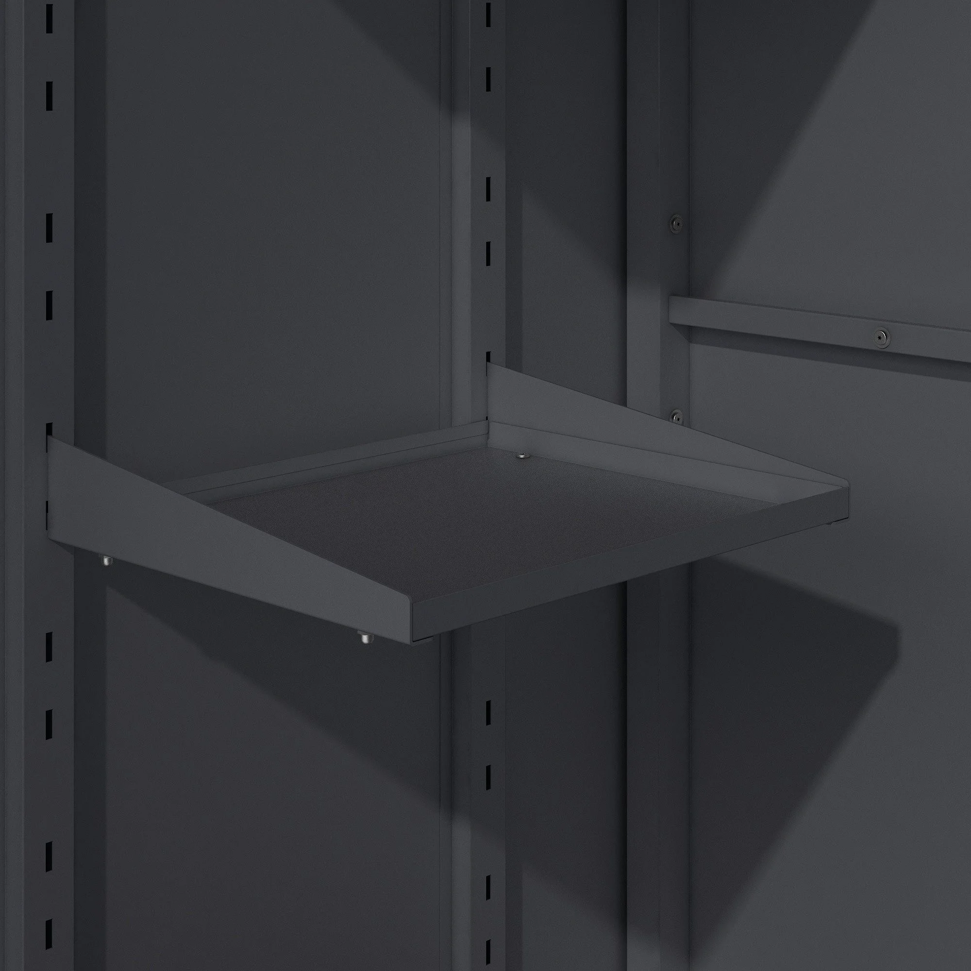 Innen bietet der Schrank drei seitliche Ablagefächer für Kleinutensilien, zwei Werkzeughalter mit je neun Halterungen und zehn flexible Haken für Gartengeräte. Die Bodenplatte trägt Lasten bis zu 70 kg, die Ablagen bis zu 10 kg. Dank rostfreier Beschläge aus Edelstahl und verstellbaren Standfüßen steht der Schrank auch auf unebenem Boden sicher und stabil.
