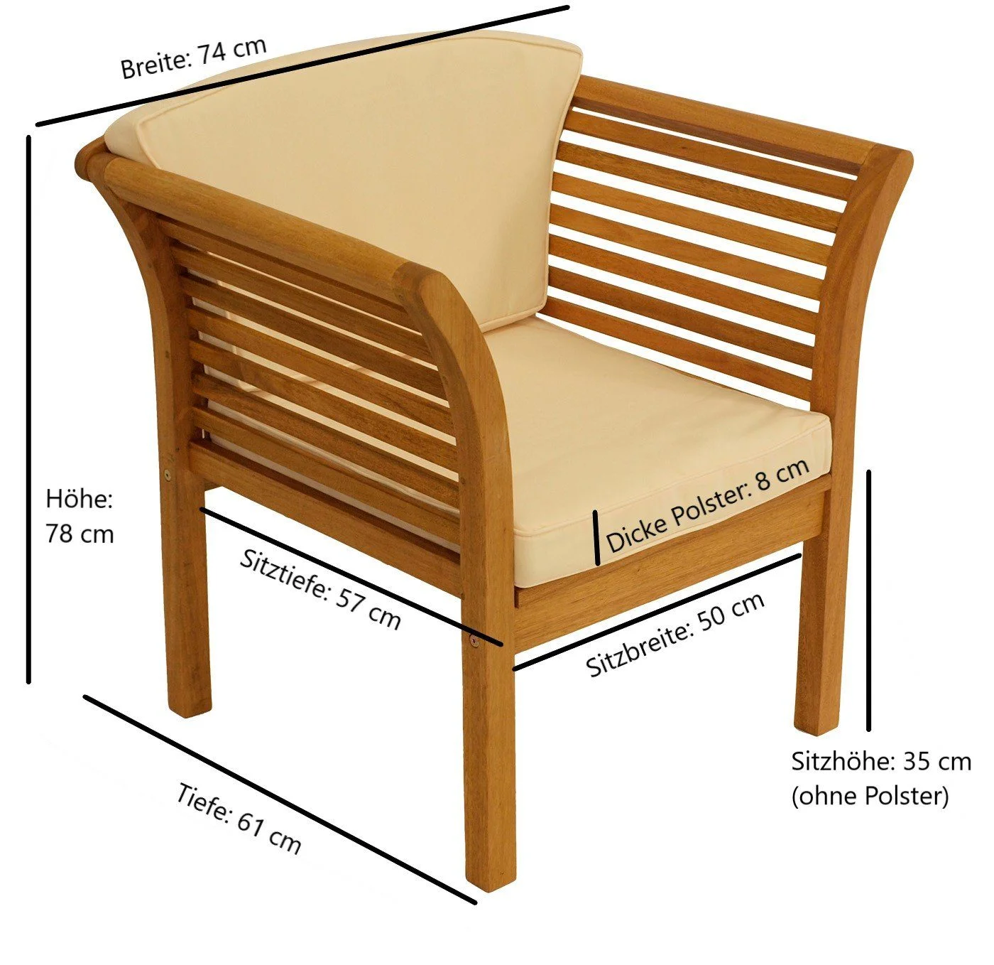 Highlights: Hochwertige Eukalyptus-Konstruktion, bequeme Polster, großzügige Abmessungen, vielseitig für drinnen und draußen, Pflegeanleitung inklusive.