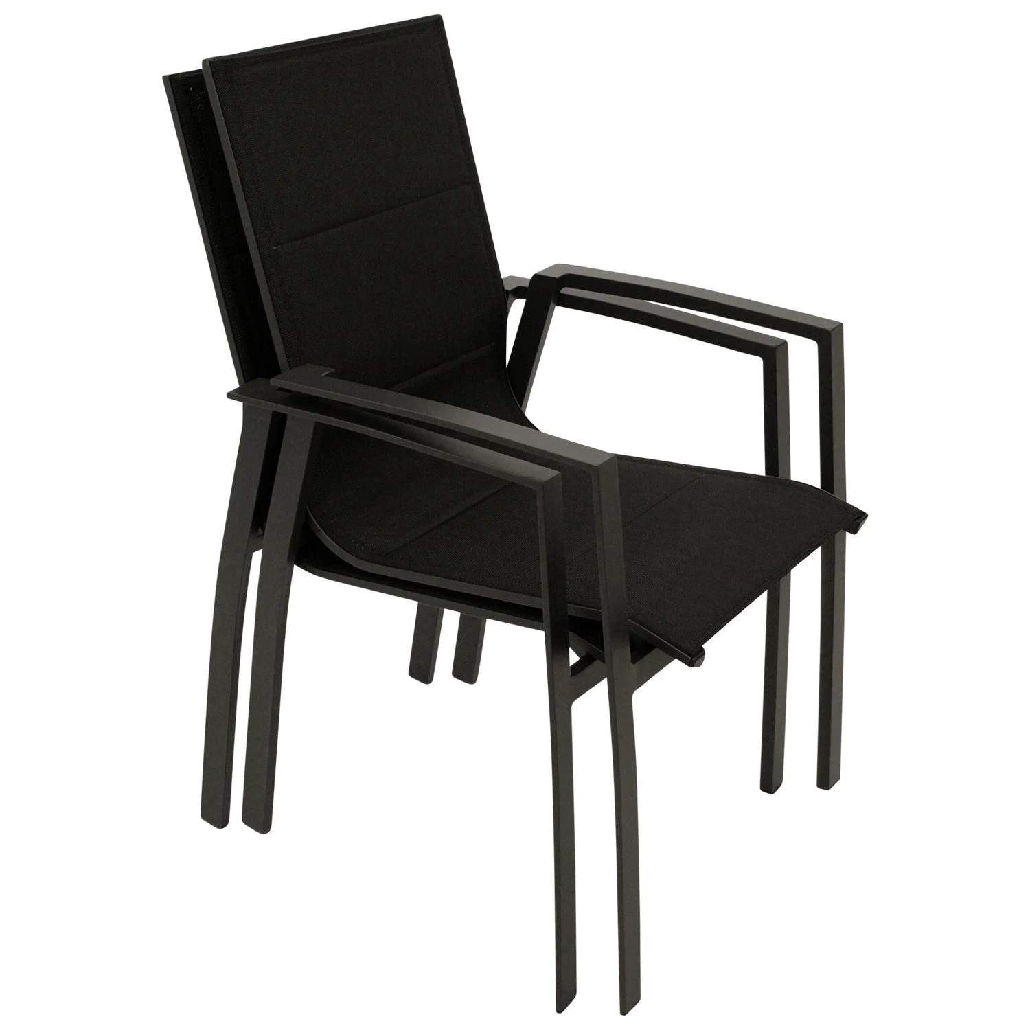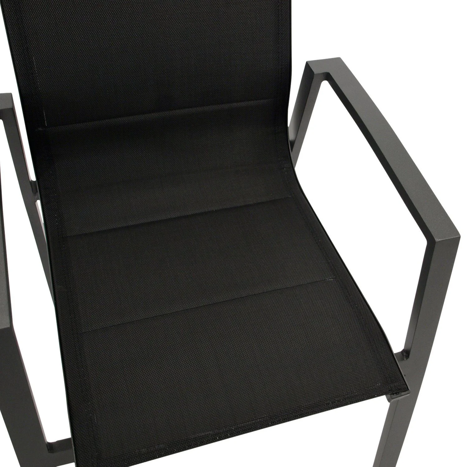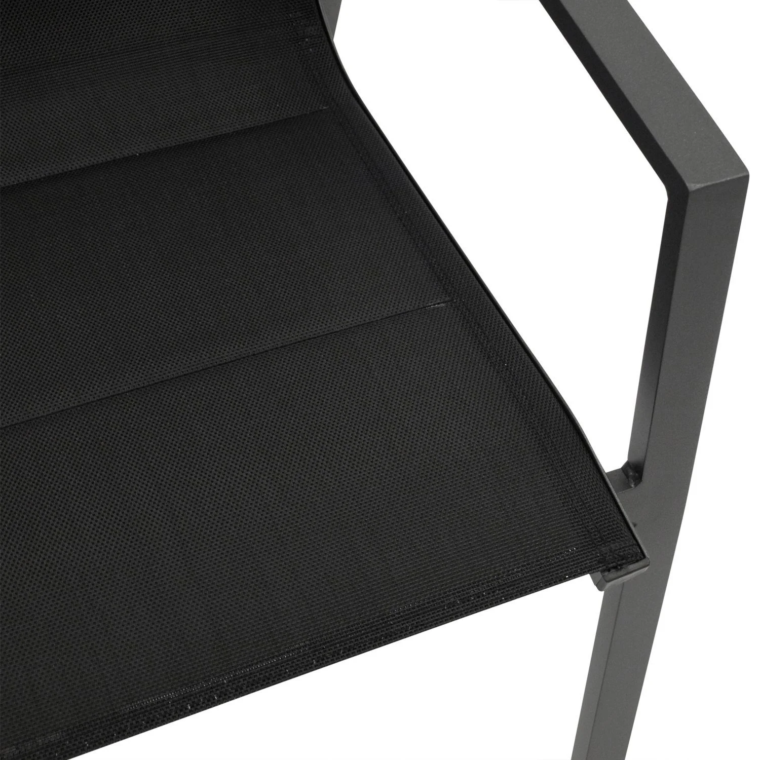 Sitz- und Rückenflächen bestehen aus wetterfestem, gepolstertem Textilgewebe in Schwarz, das sich angenehm anpasst und zusätzlichen Komfort bietet. Dank stapelbarer Konstruktion lassen sich die Sessel platzsparend verstauen.