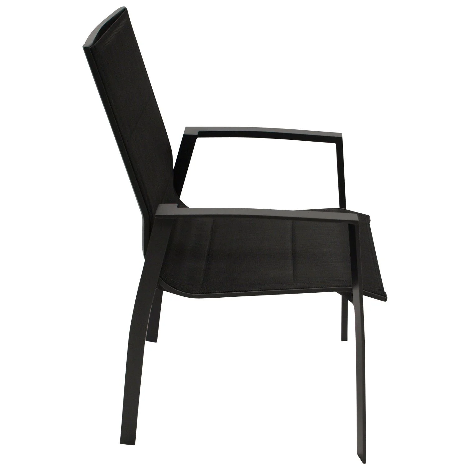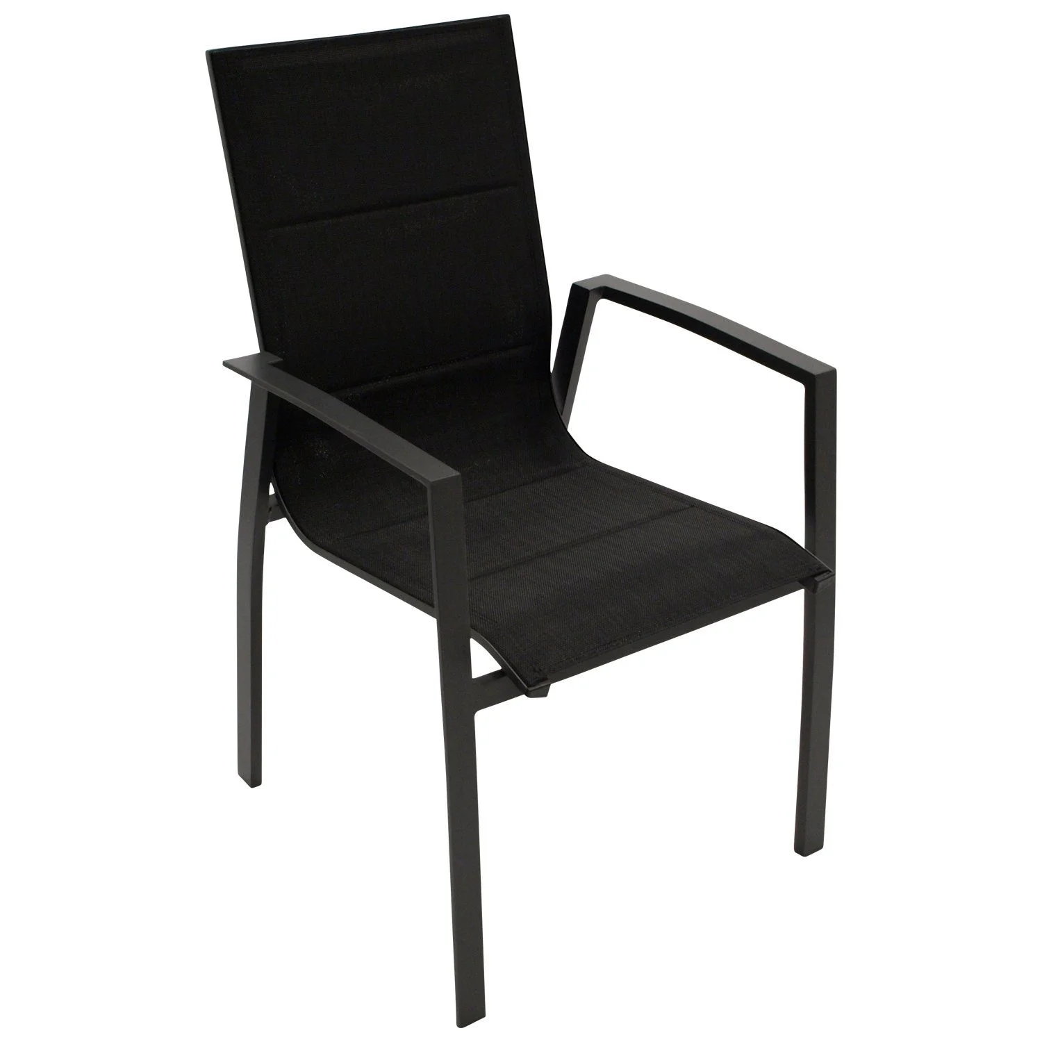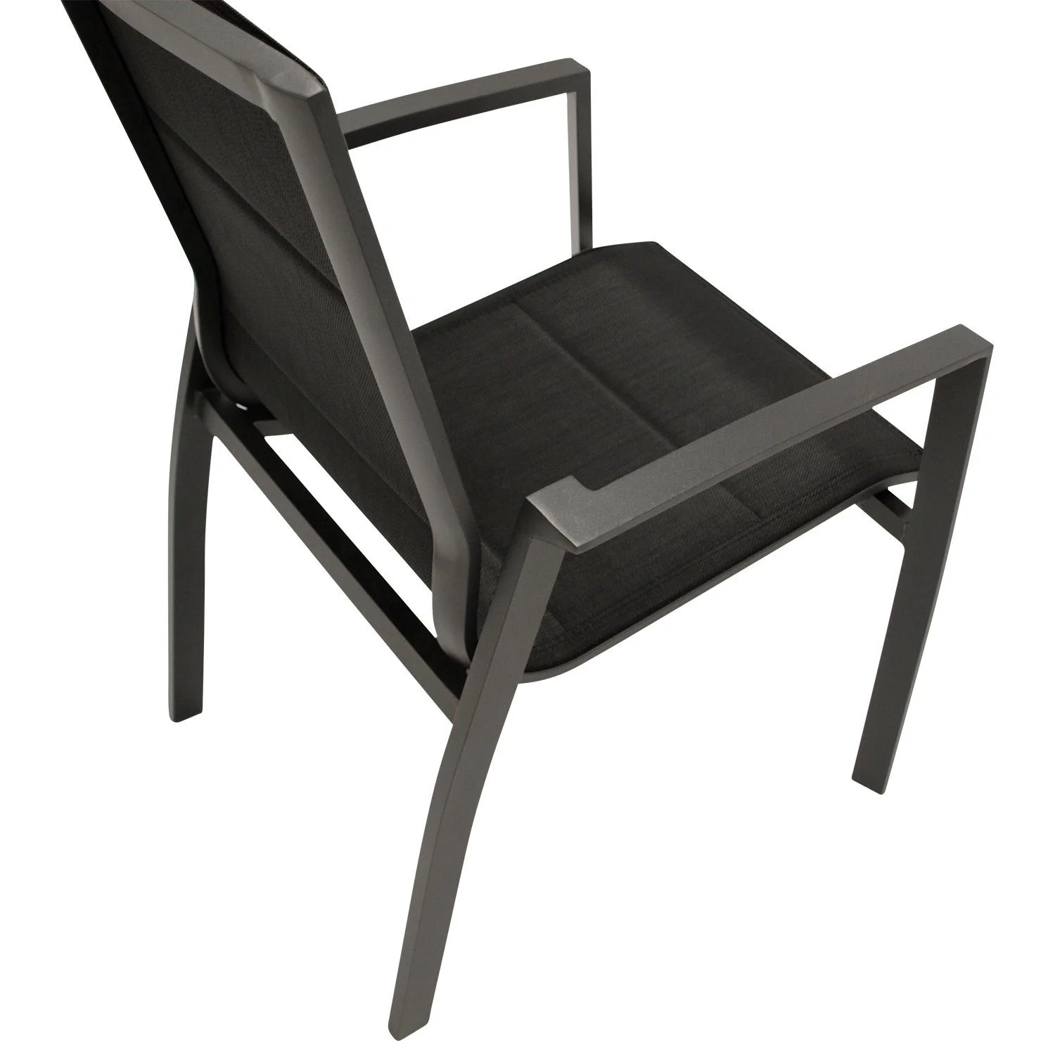 Sitz- und Rückenflächen bestehen aus wetterfestem, gepolstertem Textilgewebe in Schwarz, das sich angenehm anpasst und zusätzlichen Komfort bietet. Dank stapelbarer Konstruktion lassen sich die Sessel platzsparend verstauen.