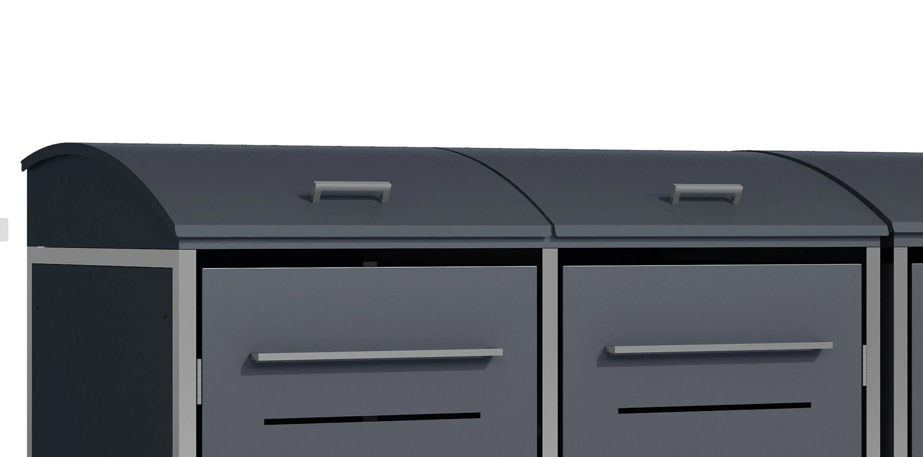 Rahmen und Griffe aus mattiertem Edelstahl sorgen für eine elegante Optik und hohe Widerstandsfähigkeit. Die Fronten sind anthrazitfarben pulverbeschichtet und besonders pflegeleicht. Der Deckel ist mit Gasdruckdämpfern ausgestattet und ermöglicht ein komfortables Öffnen. Ein integriertes Band verbindet Tonnen- und Boxdeckel automatisch.