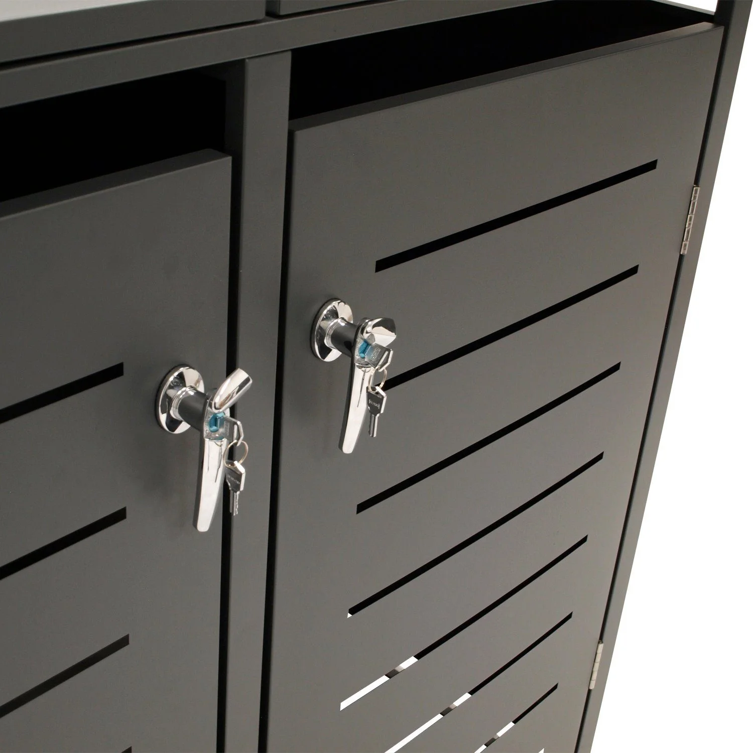 Highlights: Kompakte Bauweise, abschließbare Türen, korrosionsgeschützte Beschläge, modernes Design mit horizontalen Frontaussparungen und pflegeleichte Oberfläche.