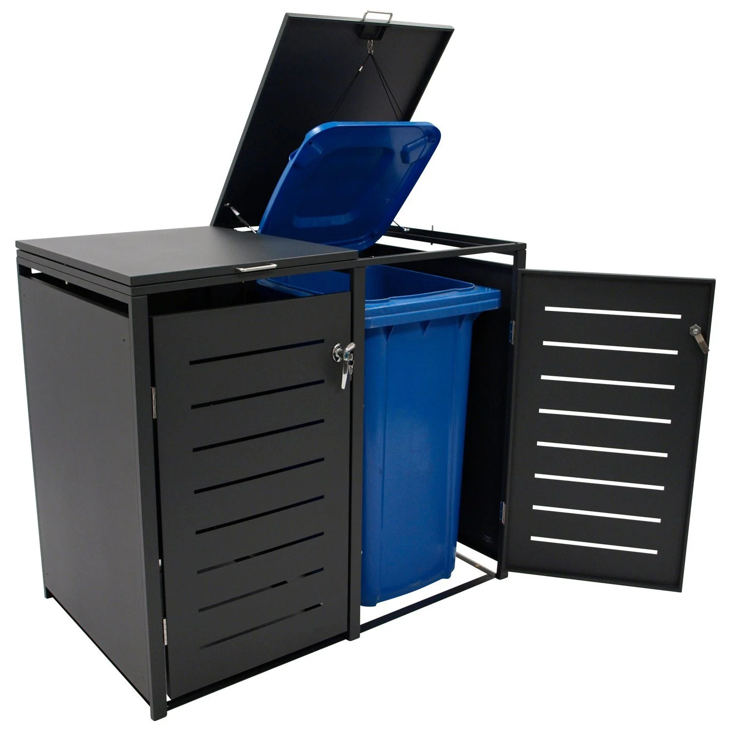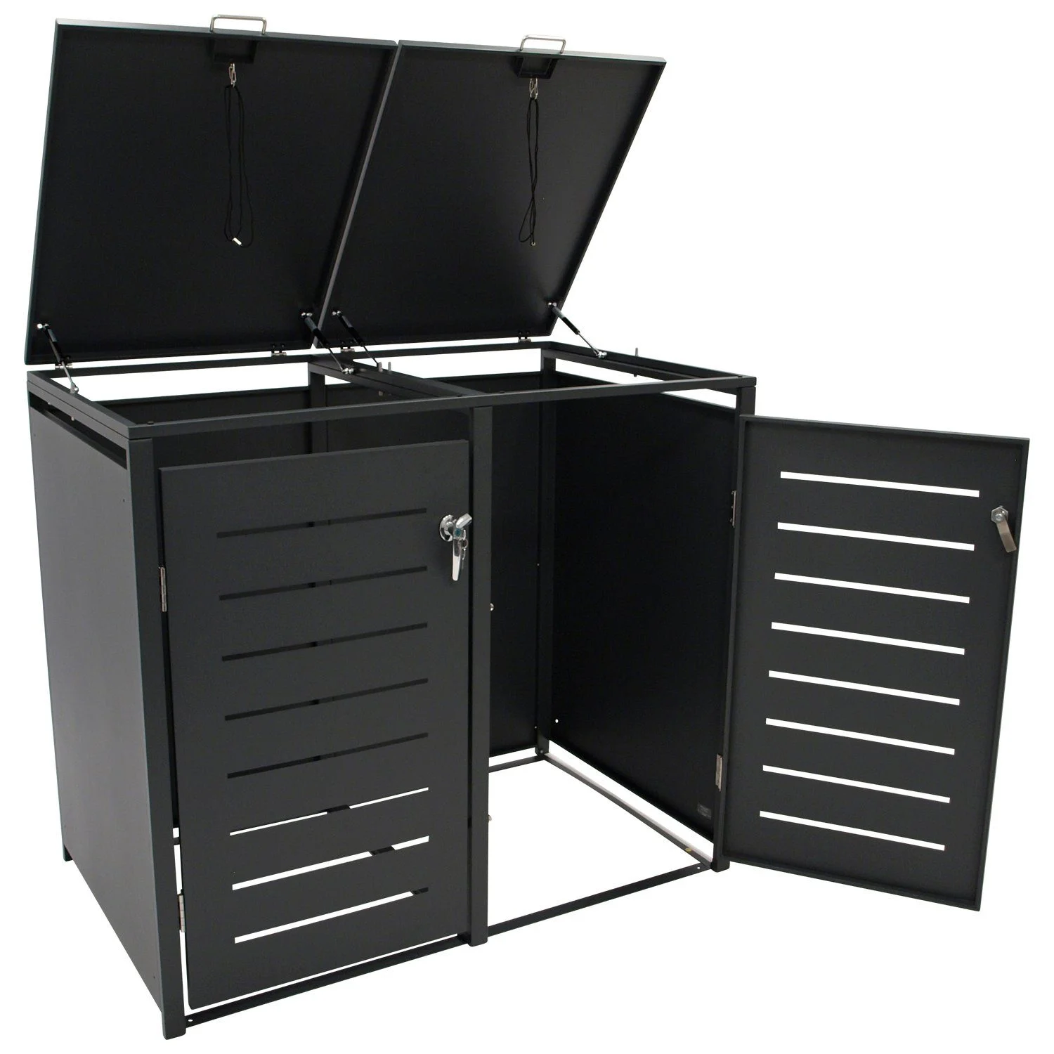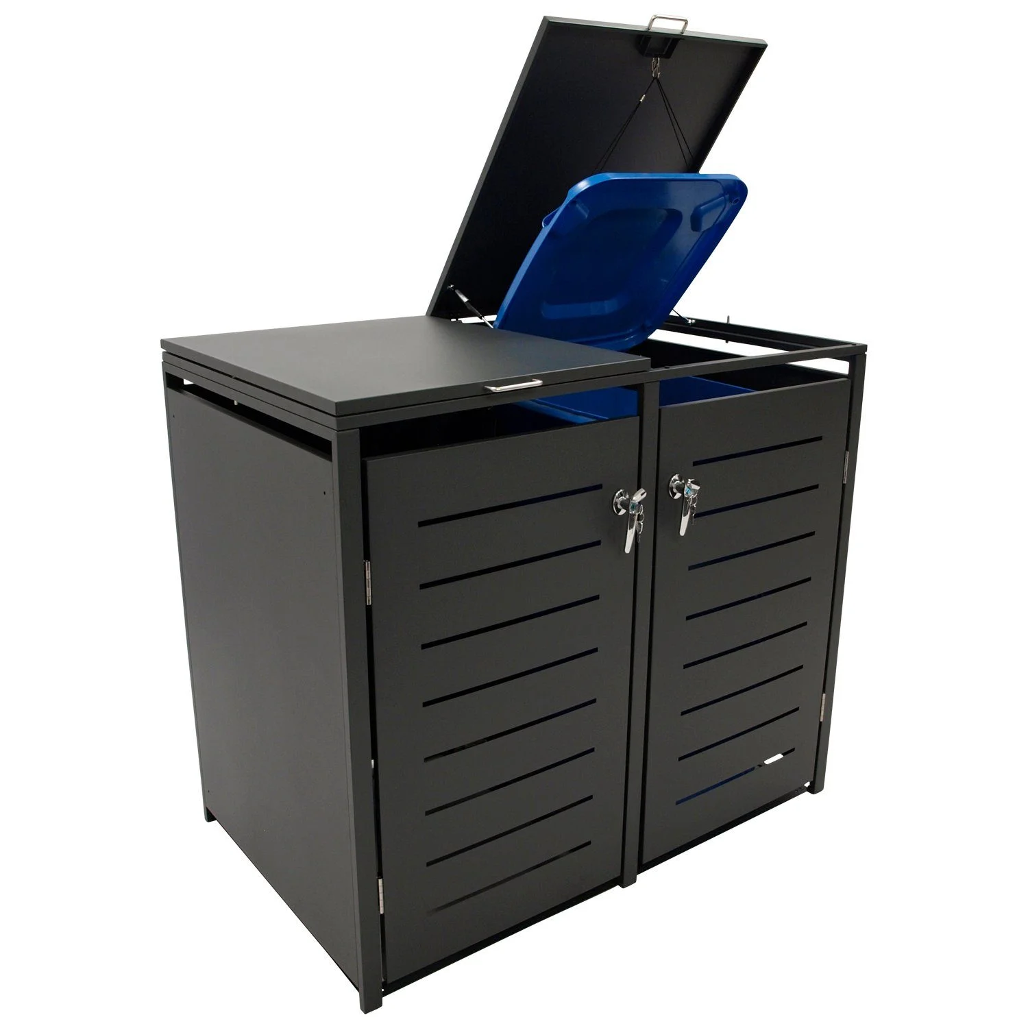 Die Fronttüren verfügen über integrierte Schlösser und bieten somit zusätzlichen Schutz vor unbefugtem Zugriff. Der obere Deckel ist mit Gasdruckdämpfern ausgestattet, wodurch sich die Box komfortabel und kontrolliert öffnen lässt. Ein integriertes Band verbindet Tonnen- und Boxdeckel für gleichzeitiges Öffnen.